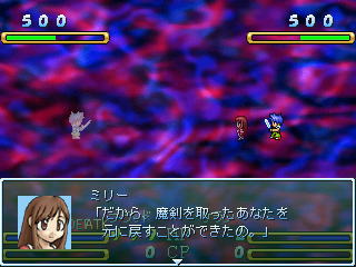 | ブラッドソードの悪魔との決戦。 ミリーはサランの剣に聖なる力を託す。 そして彼は自らの過去に決着を着ける。 しかし魔の剣は消えたわけではない。 サランはレオ達と共に、聖なる剣と共に、 魔剣と戦う決意を固める・・・ ![]() ミリーの持つ力の秘密が・・・ |